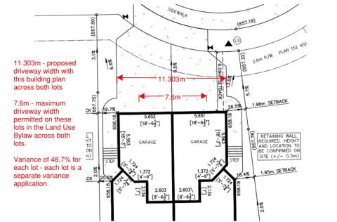 Information:  An application has been received for a semi-detached dwelling which spans 2 lots, with a common wall in the middle.  The RS Land Use District limits the maximum driveway width on these lots (which are 7.6m wide and have no rear lane access) to a total driveway width of 7.6m (or 3.8m per lot).  The applicant has requested driveway widths of 5.65m per lot - so a total width of 11.3m.  This results in a variance of 48.7% for the maximum driveway width on each of the 2 properties.  These driveways have proposed garages of the same width as the driveways.