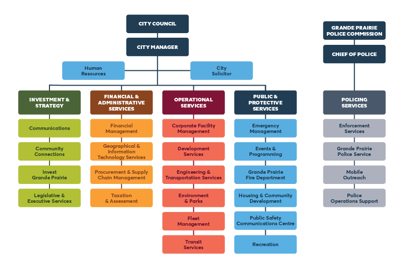 Through leadership, support, and coordination across departments, this service area advocates for the City’s interests, supports City Council, and strives to enhance quality of life in Grande Prairie. These goals are achieved through the following key departments: