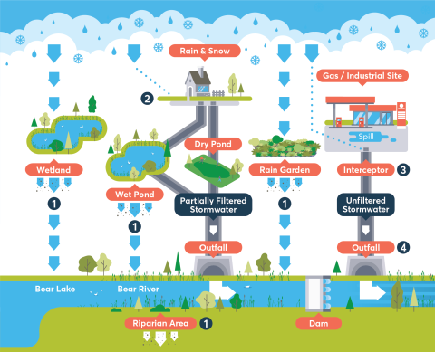 Stormwater is water from precipitation (rain, snowmelt, etc..) that accumulates on the surface. As it flows, it collects and transports pollutants (soil, pet waste, salt, pesticides, fertilizer, oil and grease, leaves, litter, etc..). Stormwater is part of the water cycle.